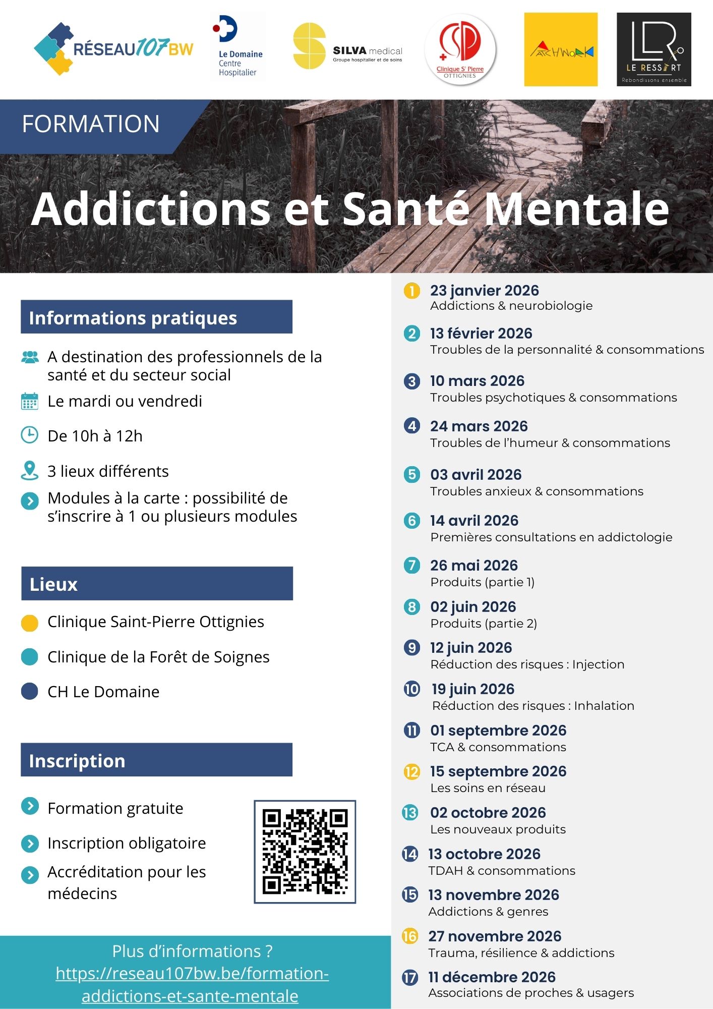 Elle est organisée dans le cadre du Projet Trajet de soins – Drogues illicites (PTSDI) du Réseau 107 BW, en collaboration avec la Clinique Saint-Pierre Ottignies (CSPO), CH Le Domaine, Clinique de la Forêt de Soignes, Patchwork, Le Ressort et l’Equipe Mobile Précarité.